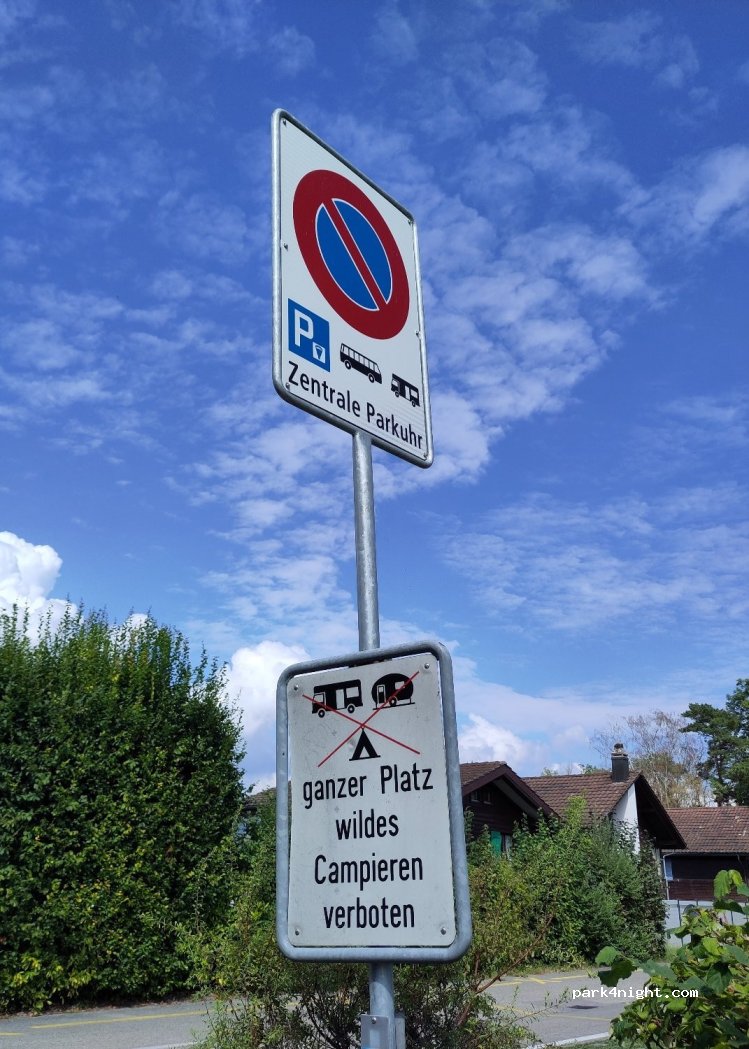 Paid parking for 3 CC. The hour 2.50 chf or the day 12 chf. Terminal to the large car park. Leave the first space on the bus garage side free for small public transport. Close to the beach, shower and public WC. Lots of places to eat. Ile Saint Pierre to be visited by bike or on foot. There is a restaurant on Ile Saint Pierre. Nice walk in the city passing by the castle.