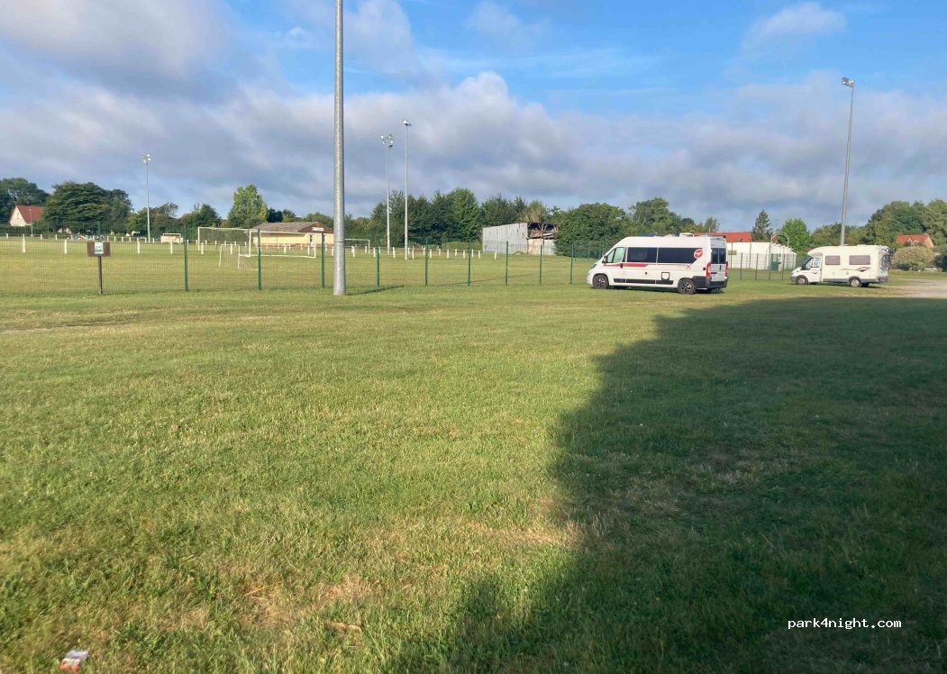 Parking à côté du terrain de foot. Très bien pour une ou plusieurs nuits. Très calme. Satellite ok. Terrain plat.