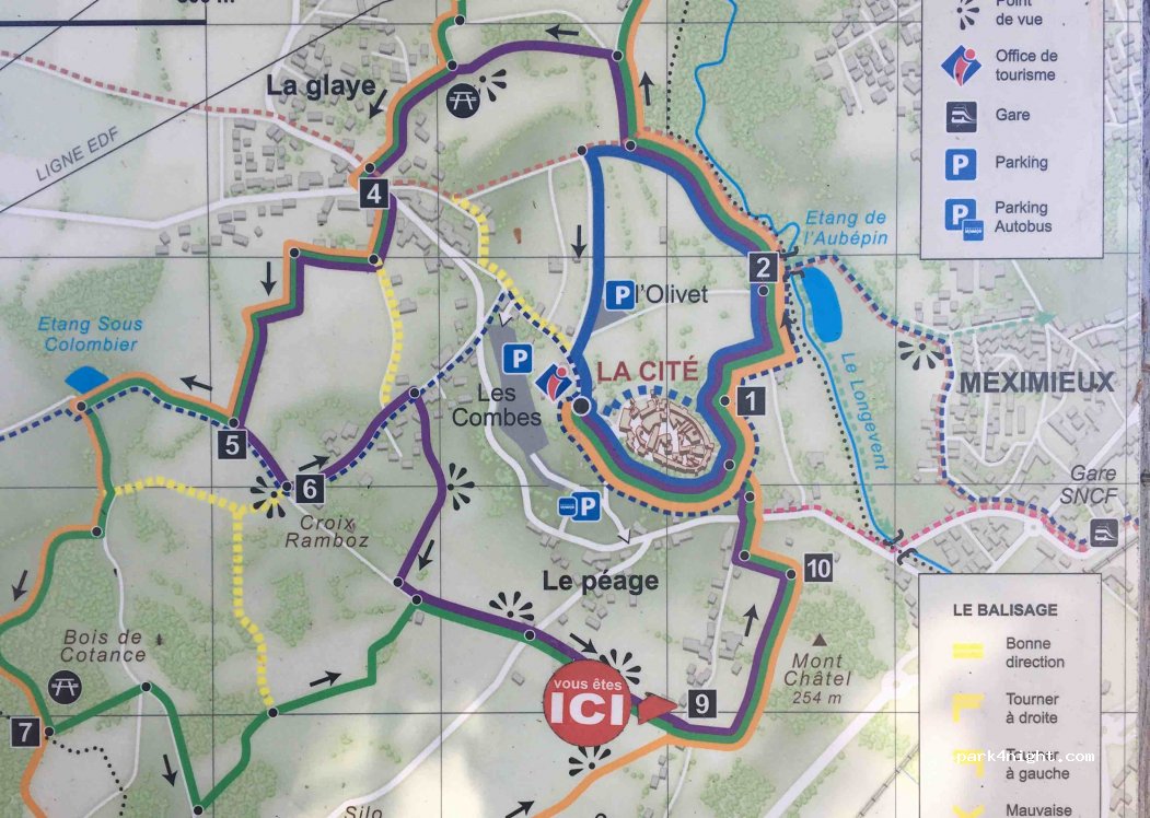Terrain municipal à côté du cimetière de Pérouges, passage de sentier de randonnée (borne avec plan au carrefour). Peu de passage le jour.