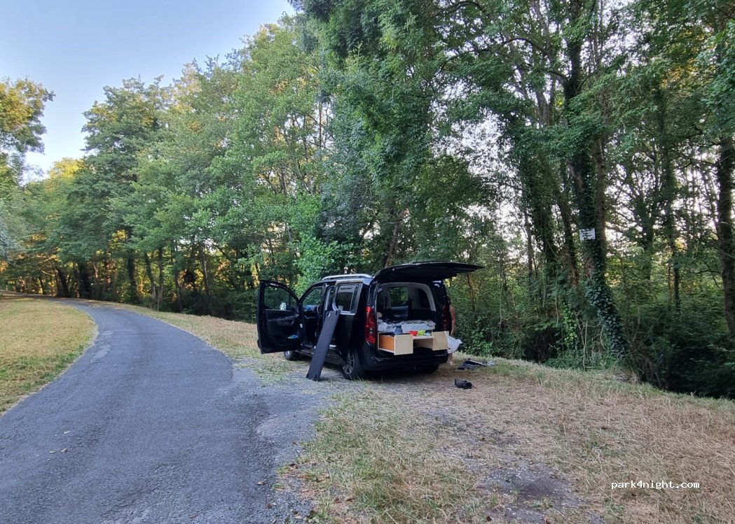 Small hunters parking lot in the middle of a forest. Very calm. Only one car passage from evening to early morning. ideal for couples. Small asphalt road to get there. ok for a van.
