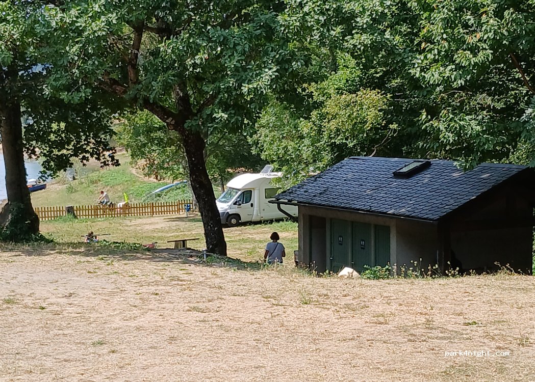 un cabine de douche ouverte sur 4, et les toiles d araignées de la saison précédente,il faut 50ml de rallonge pour se brancher ,le gérant mindique de remplir ma réserve de cc avec un jerrican ,pour 16 éuros, l aire de cc au bord du lac a 9 € est bien plus sympa ,et dispose elle , d une vidange eau grises et eau noire, d une prise sur chaque emplacement et de la possibilité de faire le plein d eau