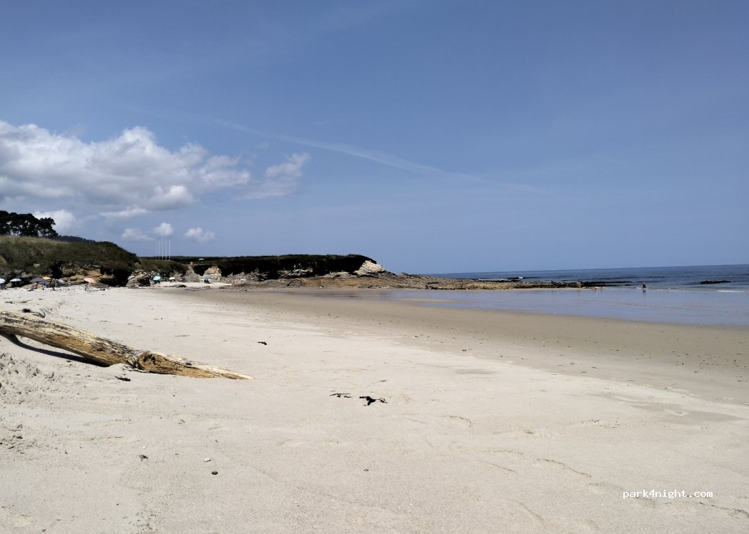Es un sitio maravilloso. Hemos parado muchas veces. Es una pena, porque tenía una fuente y hemos visto q ahora ya no funciona. Hay duchas en la playa y baños muy cerca (al otro lado de la playa). Es un sitio tranquilo aunque por la mañana hay movimiento. Hay un paseo precioso que va por la costa hasta foz para caminar o correr.