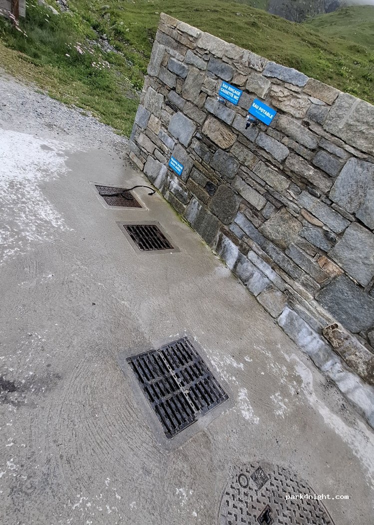 Petite aire en bord de route (à côté de la petite cabane en bois), avec 2 robinets à bonne pression pour le remplissage d'eau et nettoyage de la cassette WC.