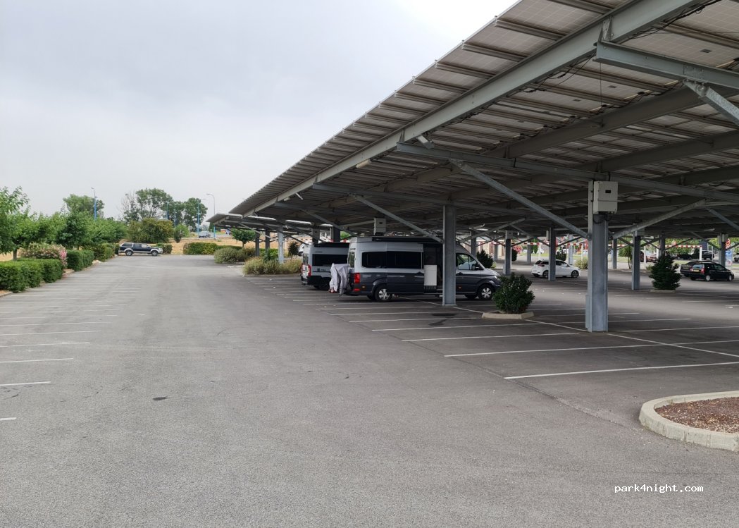 sauberer Parkplatz mit teilweiser Überdachung. Für Übernachtungen weniger geeignet, da nahe an Hauptverkehrsstraße und Bahntrasse.