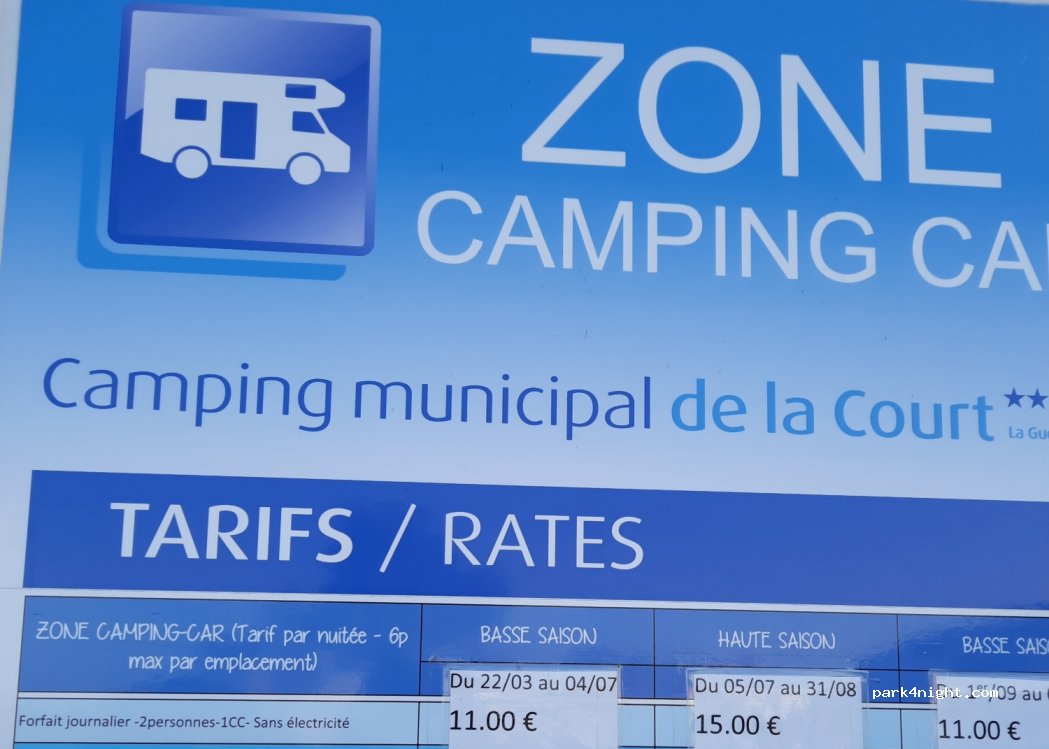 air de service du camping de la court ne pas confondre avec l'escale de la gueriniere situé à côté. pour une nuit sans électricité avec les services accès à la piscine et aux sanitaires nous avons payé 12.32€ pour 2 personnes avec la taxe de séjour prix raisonnable pour une aire en bord de Mer.
