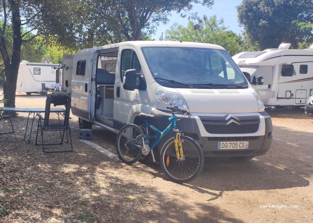 Motorhome welcome. Secure place with access code, pleasant and shaded, shops nearby, cycle paths, close to the beach. The price includes water, emptying, use of campsite toilets and swimming pool.