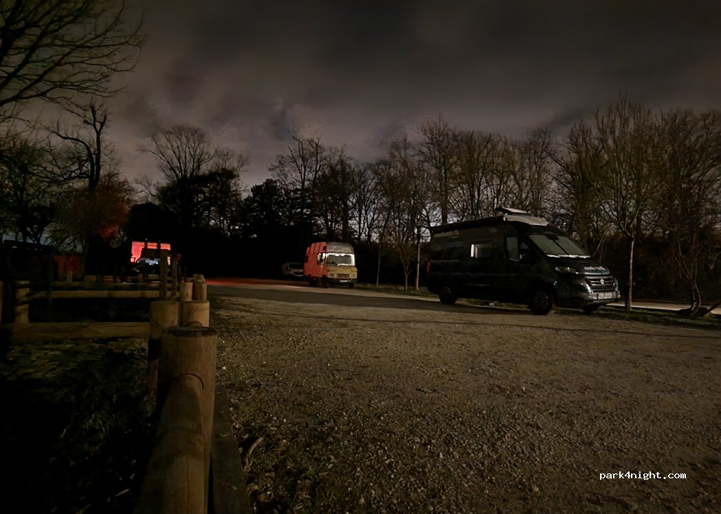 Parking retiré de la ville, parfait pour une nuit au calme. Quelques voitures sur le petit matin, les personnes se rendant au parc pour marcher ou courir. Propre, plat, éclairé, je recommande pour une nuit