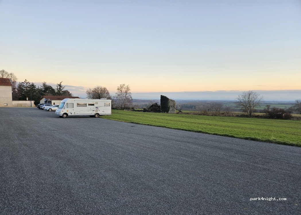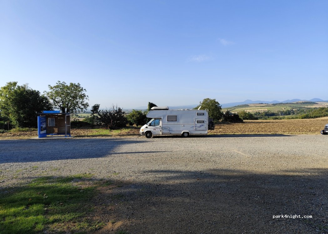 Parking d’une salle de fête. Très beau, avec une vue dégagée sur la vallée. Calme si ce n’est quelques voitures qui passent sur le parking mais calmement pour la plupart et pas la nuit. À recommander !
