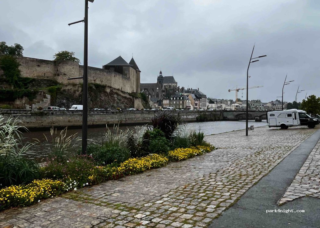 Parking sur les quais par le centre ville, pas facile à trouver, pas de panneau, j'ai demandé à l'office du tourisme, effectivement c'est à côté. Nous avons pris le café de l'après-midi sur un banc au bord de la Mayenne avec les pêcheurs, très agréable. Un second endroit indiqué sur cette application pour camping-car (symbole camping-car vert) impossible à trouver, si quelqu'un à l'info, merci de la partager.