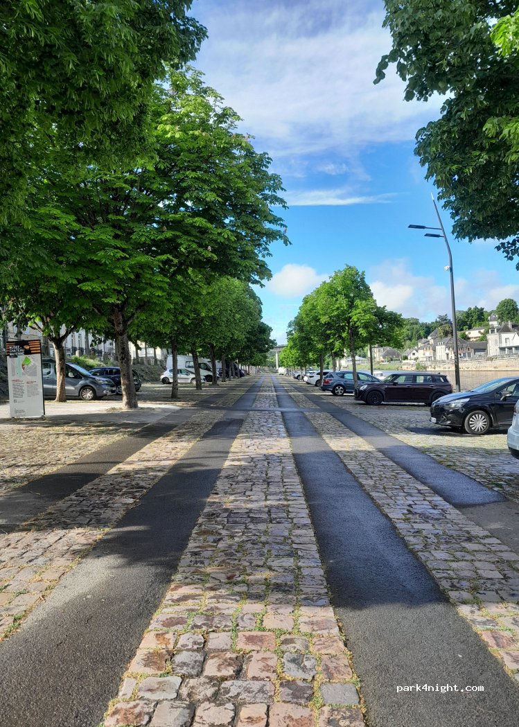 Quite peaceful. Mayenne is a little jaded and you might struggle to find a good place to eat or drink. Sad really. This side of the river the spaces are on a slope. Looks like a couple of campers went the other side where roadside parking is flat. I can see at least 4. Nice to stop on the way back to Cherbourg, but nothing special.