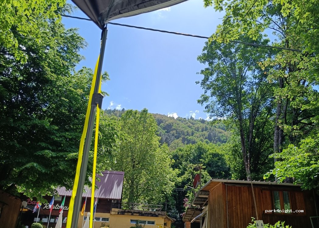 Campsite surrounded by nature, completely in the shade of the forest. There are not many pitches for campers but they are well integrated with the bungalows. Several embers, clean bathrooms and a restaurant with a bar inside that also does take-away dishes (abundant by the way). Very kind and welcoming lady. Gray water discharge a bit tight but ok. Total relaxation in the middle of the woods !!