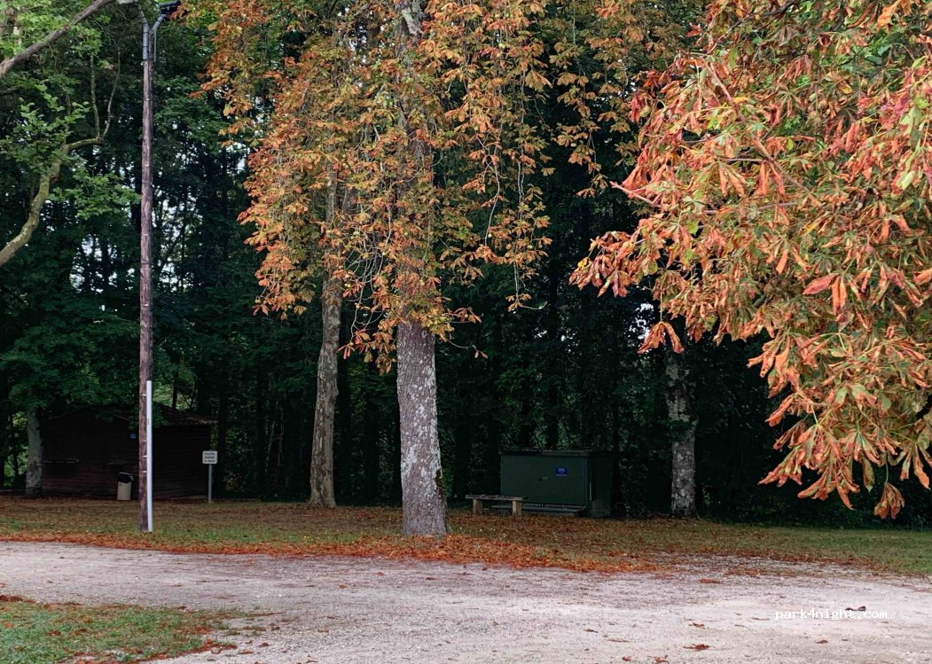 Viele Stellplätze unter den Bäumen, öffentliche Toiletten vor Ort.