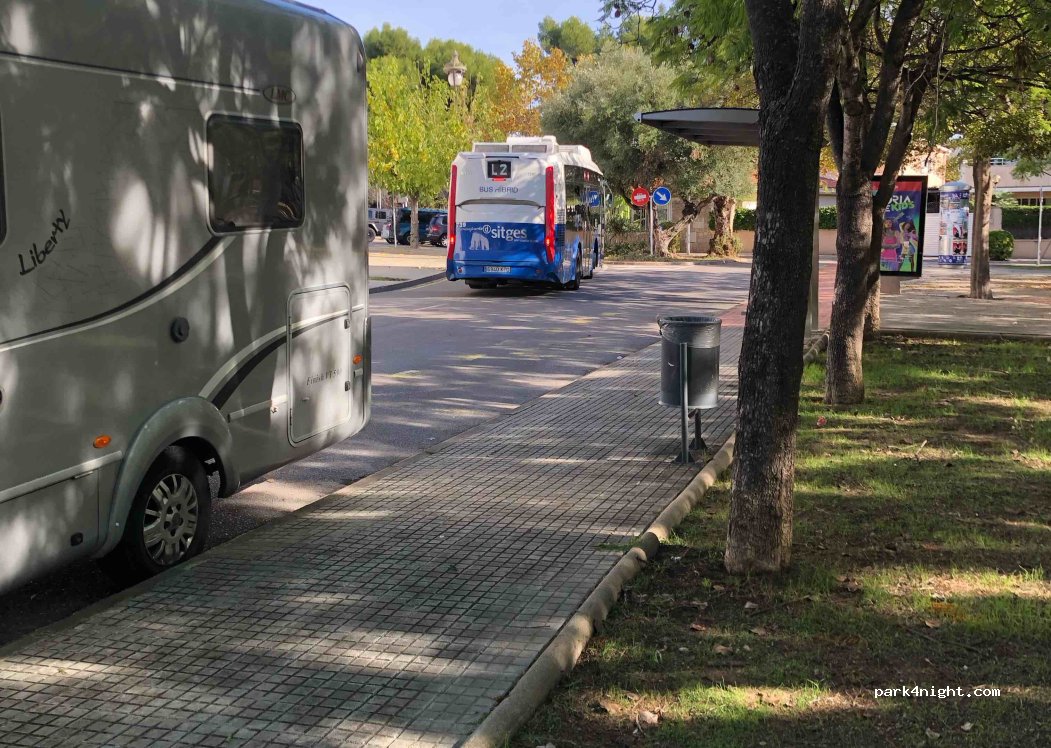 Nosotros hemos pasado la noche aquí no es el mejor lugar del mundo pero como dice el compañero el parque la fuente y la tranquilidad está correcta se escucha un poquito el tren pero nada que te impida dormir y lo mejor es que por 1,5 euros por persona y trayecto el bus de la L2 te leva del sitio a la estación de tren justo al centro de Sitges en resumen es un sitio bueno