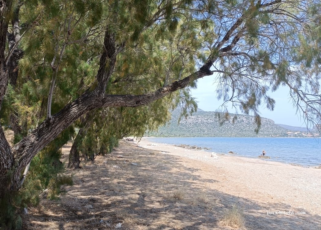Spiaggia molto bella con vista su Monemvasia. Area con diversi parcheggi all'ombra, doccia pubblica e cassonetti della spazzatura. Cartelli di divieto camper, ma situazione comunque molto tranquilla. No WC come descritto in precedenza.