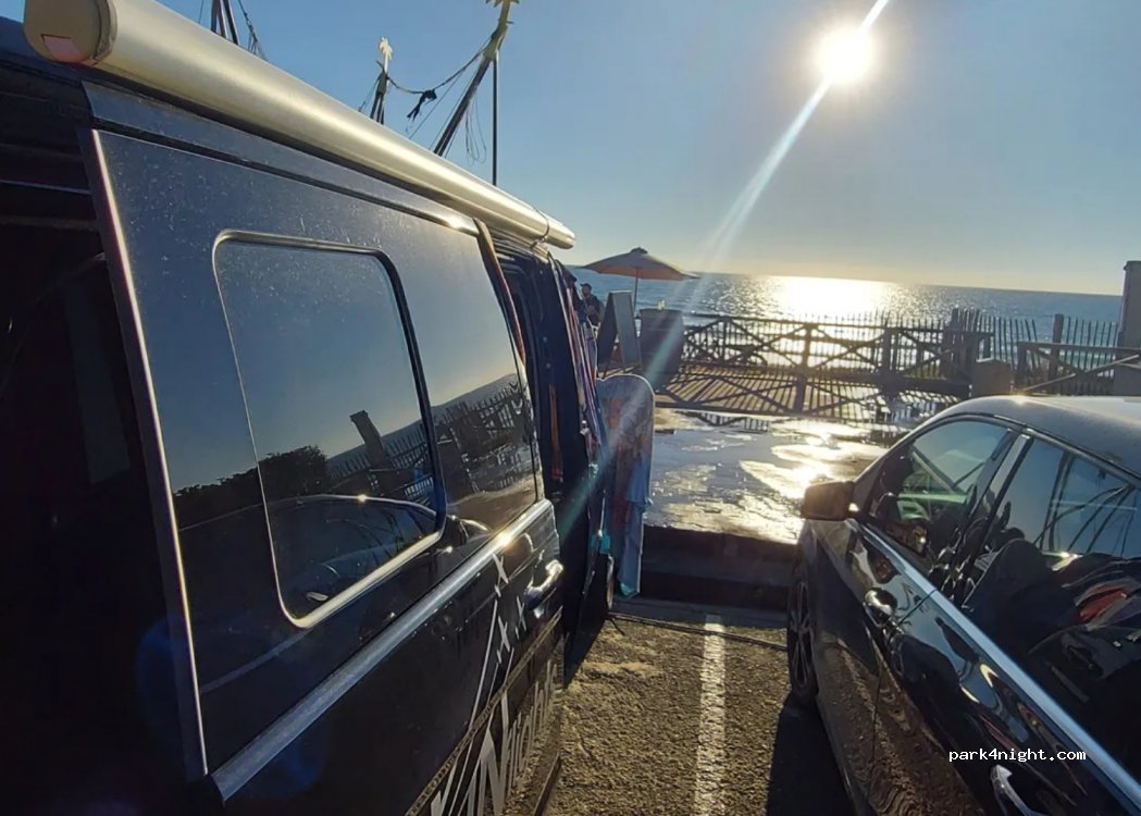 Parkplatz auf Höhe 1,90 begrenzt. Ein wunderschöner Ort! Parken hinter am Strand und die Bars direkt vor Ort. Ein Aufwachen mit Meerblick. Hinweis: der Parkplatz ist in mehrere Abteilungen geteilt, der Länge nach vor der Promenade. Parkt dort auf dem ganzen rechten Abteil (rechts von Blickrichtung Meer), dort habt ihr nachts am meisten Ruhe vor den Bars.