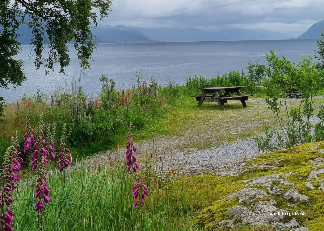 Very nice area with various possibilities to park your car. Beautiful view of the fjord, kids playground, kitchen, clean toilets. We went fishing there also.
