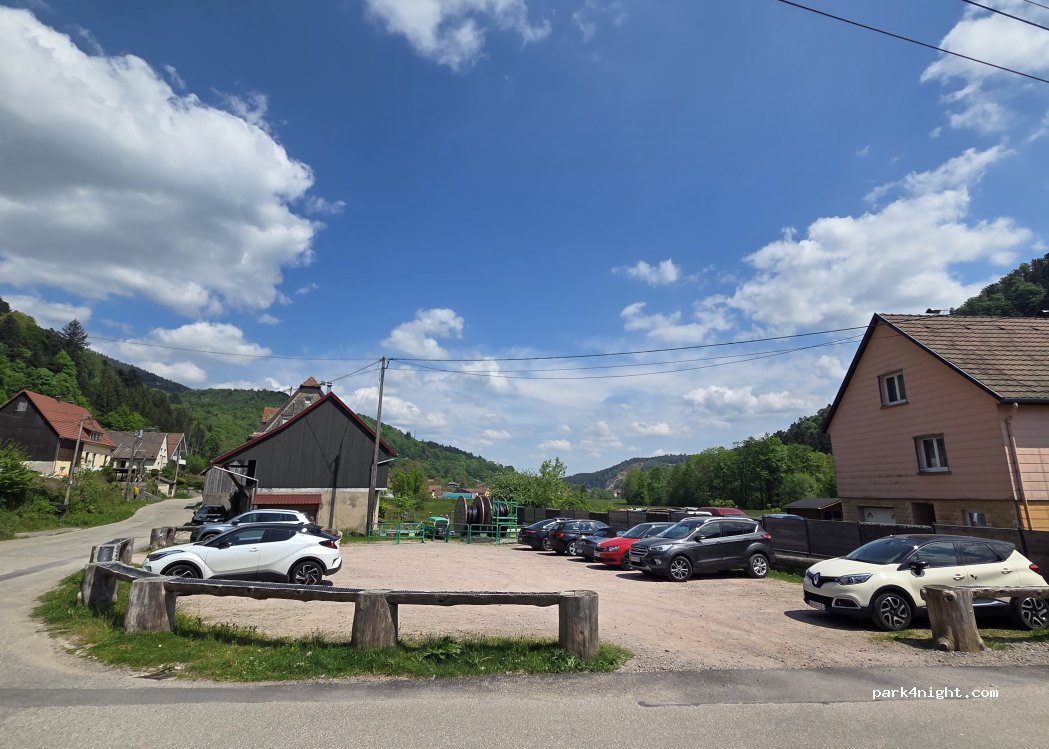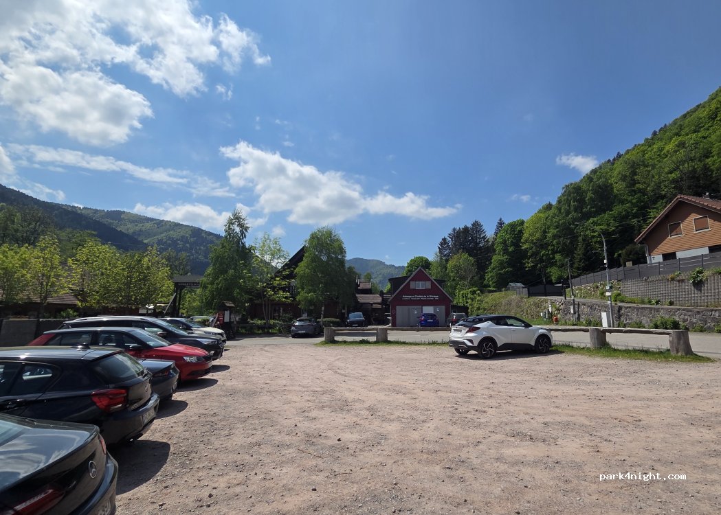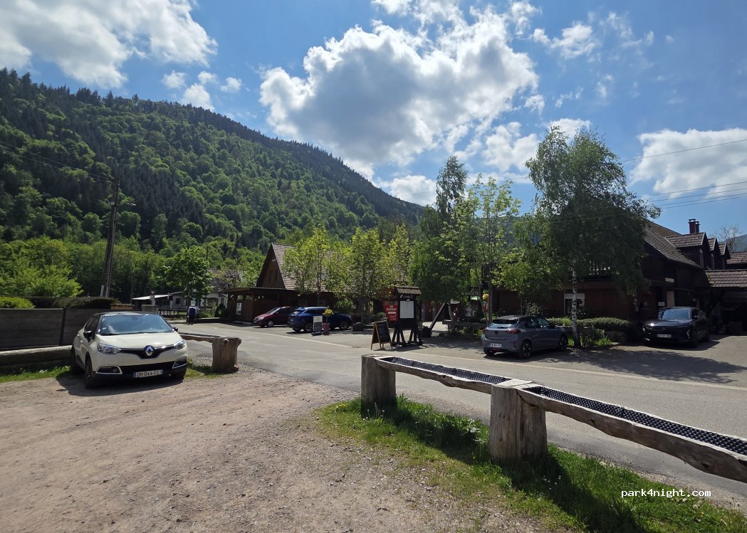 Small car park quiet at night. Departure of mountain hikes (Gr 5) to lakes. Village center 1 km, farm with sale of milk munster, butter 5 minutes. I parked 2 nights without problem. Facing a good quality restaurant with swimming pool, laundry ...