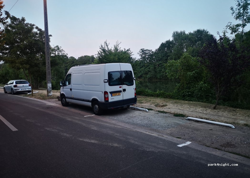 Rustige veilige, overnachtings plek aan een zijtak vd Seine. Doorreis plaats. S'avonds vrijwel geen autoverkeer. Alleen wandelaars/fietsers. Kleine groenstrook voor de stoeltjes.
