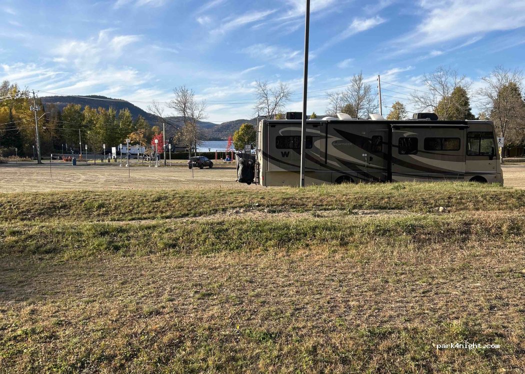 Grand stationnement plat. Plusieurs vans sur place. Parc actif l’été mais calme la nuit. Autorisé par la ville 2 nuits. Toilettes sur place. Baignade au lac. Tables pique nique et petit bbq. Parfait.