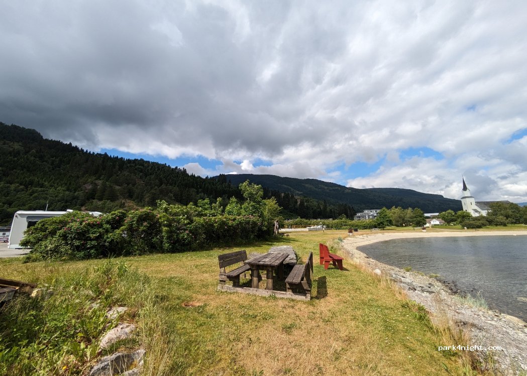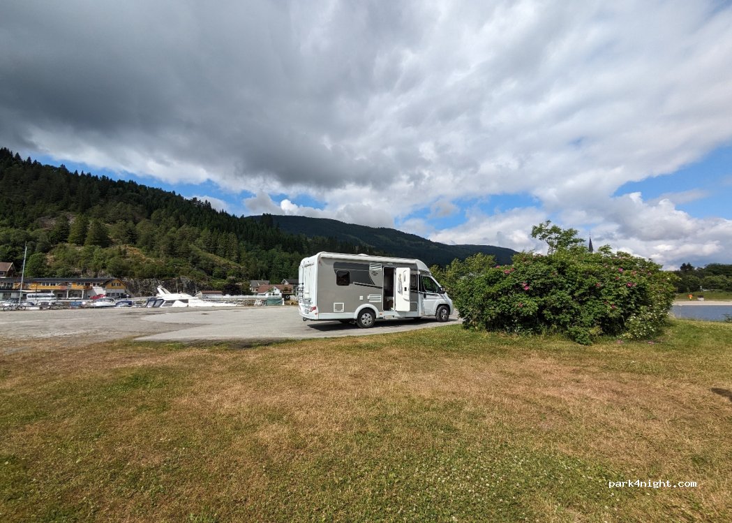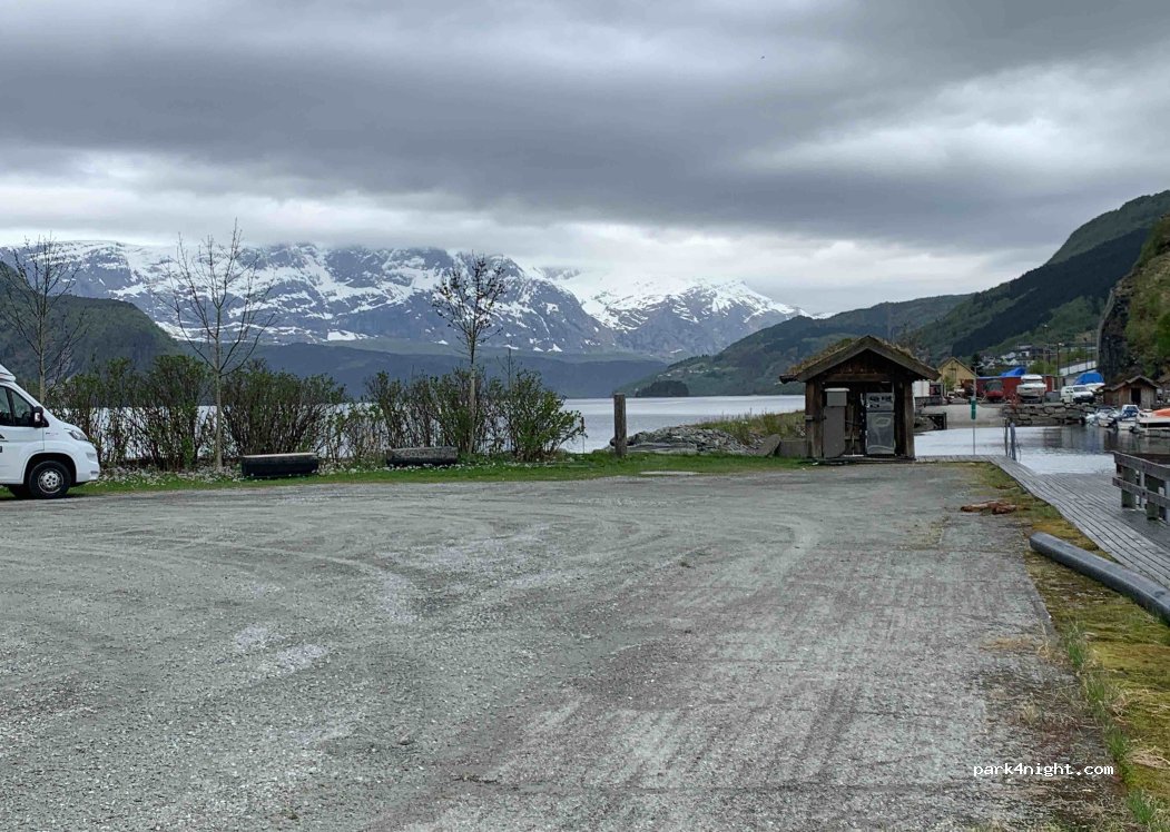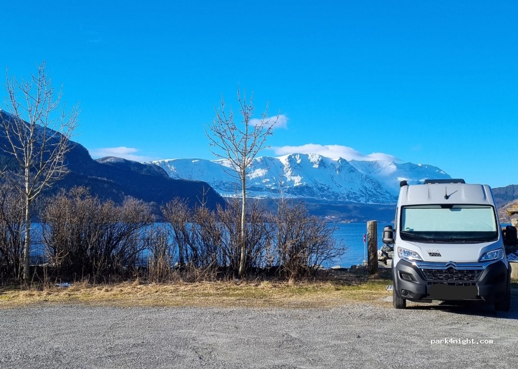 Der Parkplatz am Rande der Ortschaft ist hervorragend für eine Übernachtung geeignet. Wir standen mit Blick zum kleinen Hafen und auf die noch schneebedeckten Berge. Eine sehr liebevoll angelegte Badeseeanlage am Fjord liegt direkt nebenan. Ebenso ein Supermarkt.