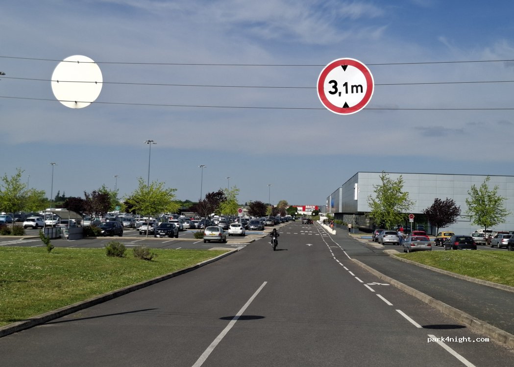 nous avons stationnés 3 nuits sans problème...il y a 8 places délimités sur sol dur. mon camping car 3.15 m passe sans problème. pour ce qui est des dos d'âne il suffit de prendre la première allée à gauche en entrant et ensuite allée centrale. borne ouverte à partir 1 mai. Centre leclerc : location voiture,restaurant, carburant et gpl,traiteur, pâtisserie super à 2.50 e. librairie. merci...