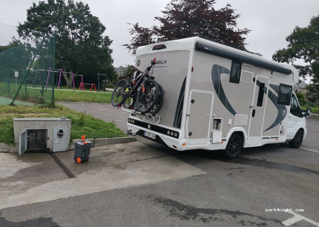 la municipalité autorise les cc pour la nuit . Ce grand parking est en pente, beaucoup de voitures y roulent la nuit et les occupants sont très bruyants . Jour de la fête des fraises, les poubelles débordaient. Attention 1 seul robinet pour eaux propres et noires, inacceptable au niveau hygiène.