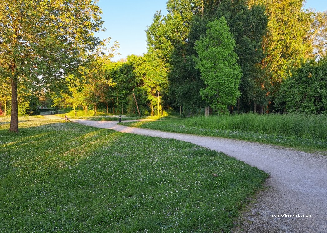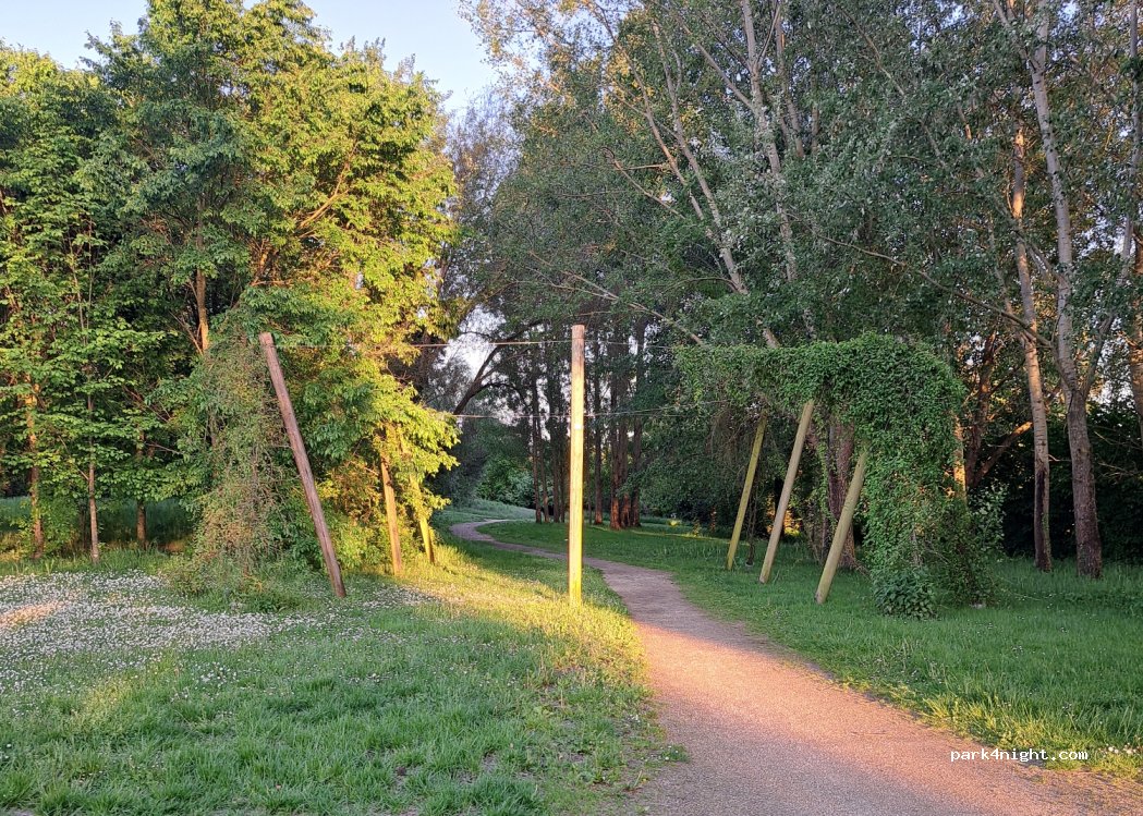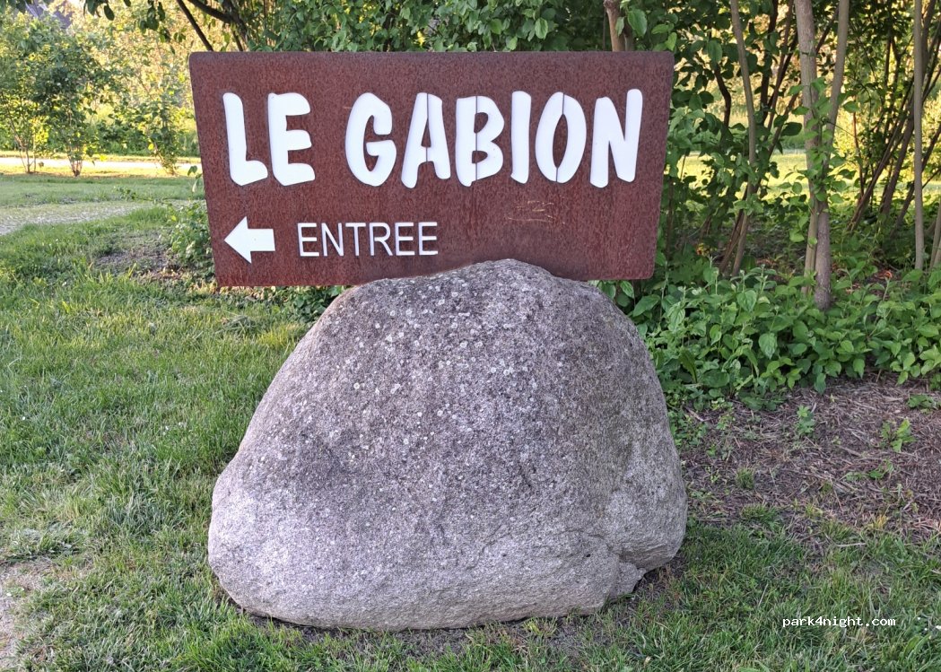 A parking lot in front of an event building at "Espace Gabion" with a park for a little walk with a playground. If there are no events, the parking lot is almost empty and so easy to use.
