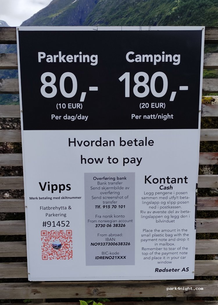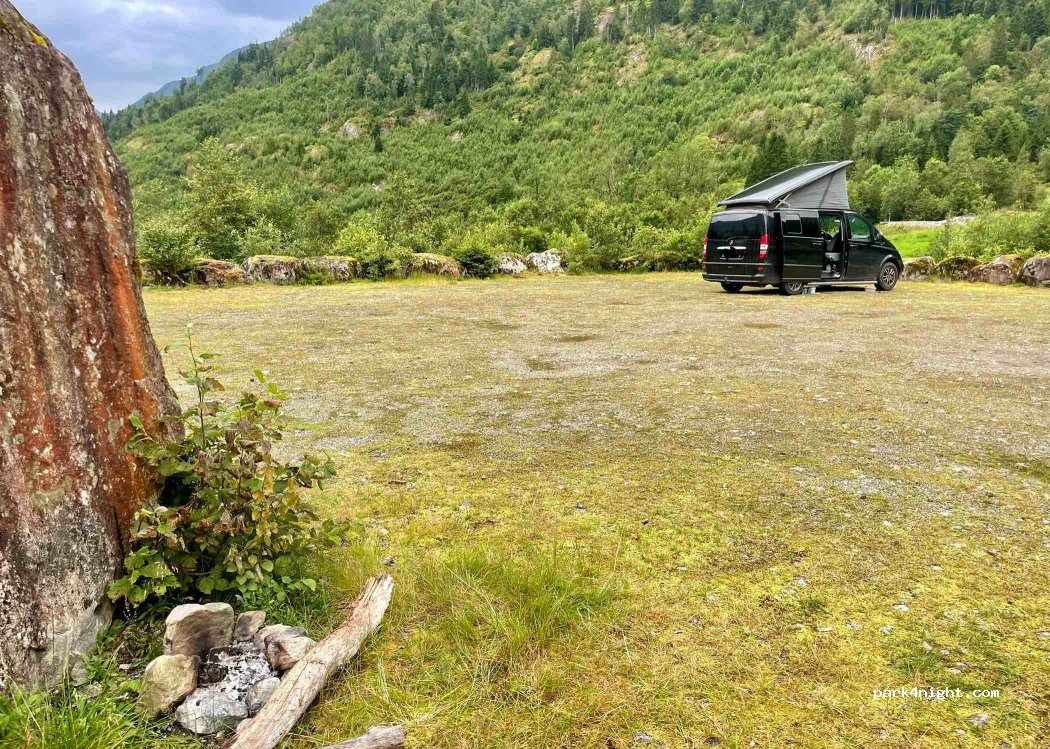 Magnifique vue sur la vallée, calme et spacieux, nous étions seulement 2 campeurs cette nuit. Avec nos banques françaises il a été impossible de faire le virement des 180 NOK à l'IBAN norvégien, il a donc fallu laisser 20€ en espèces... Aucun service comme prévu : des toilettes très propres et une poubelle sont disponibles au pied du glacier 1.5km plus loin (parking interdit au camping)