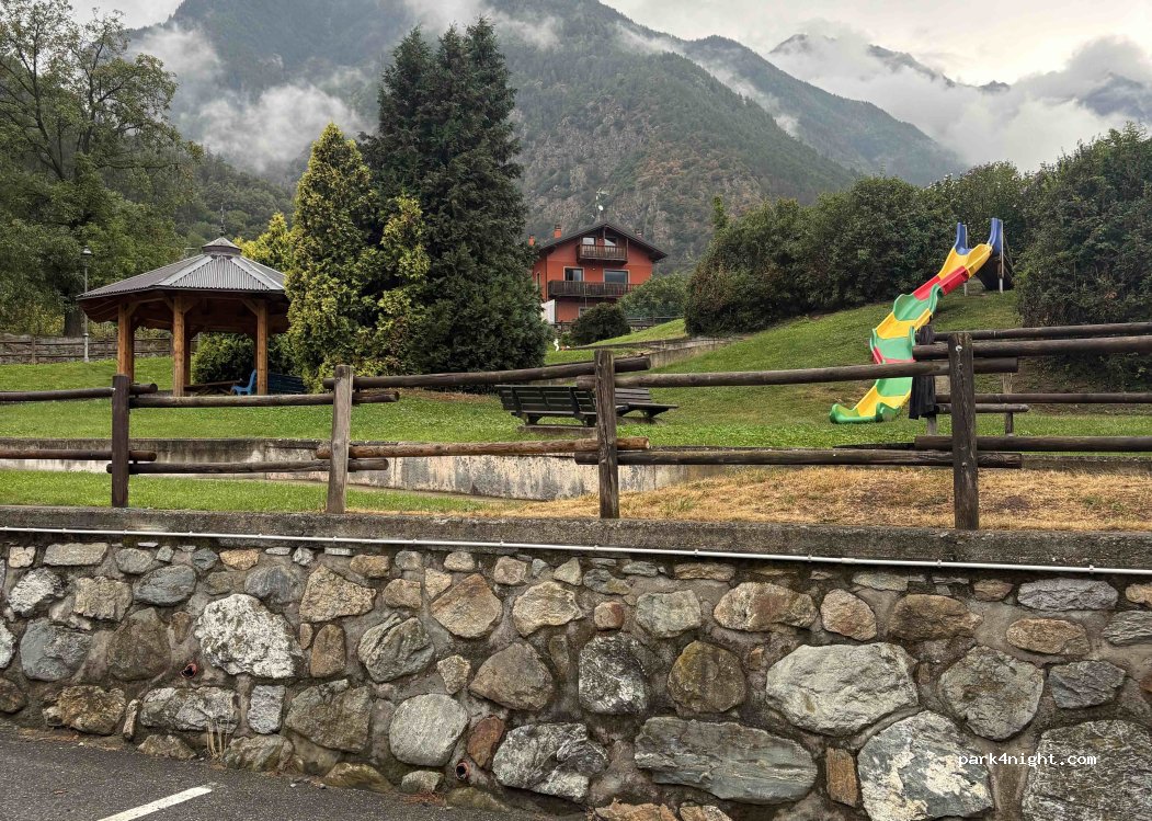 Small quiet village car park below the children's playground, except on Wednesday parking prohibited from midnight to 3 p.m. Seen on the Aosta Valley and the castle and monuments not far away. Motorbike departure for the Col du Grand Saint Bernard. There are public toilets closed in the evening and regional products and water payable in the car dispenser.