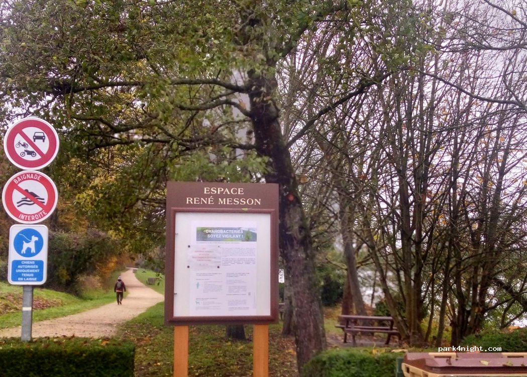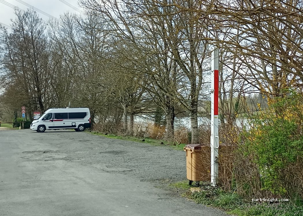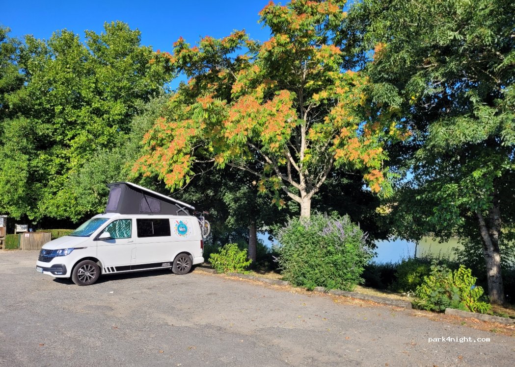Petit parking voitures,propre et plat,accessible facilement car la barrière de hauteur est, en partie,démontée.Jolie vue sur l'étang, tables et poubelles à disposition. Pêche interdite mais jolies balades. Nuit possible , seulement 2 voitures arrivées vers minuit et reparties,après leurs échanges. Nous avons fait nos courses à La Charette, magasin de producteurs.