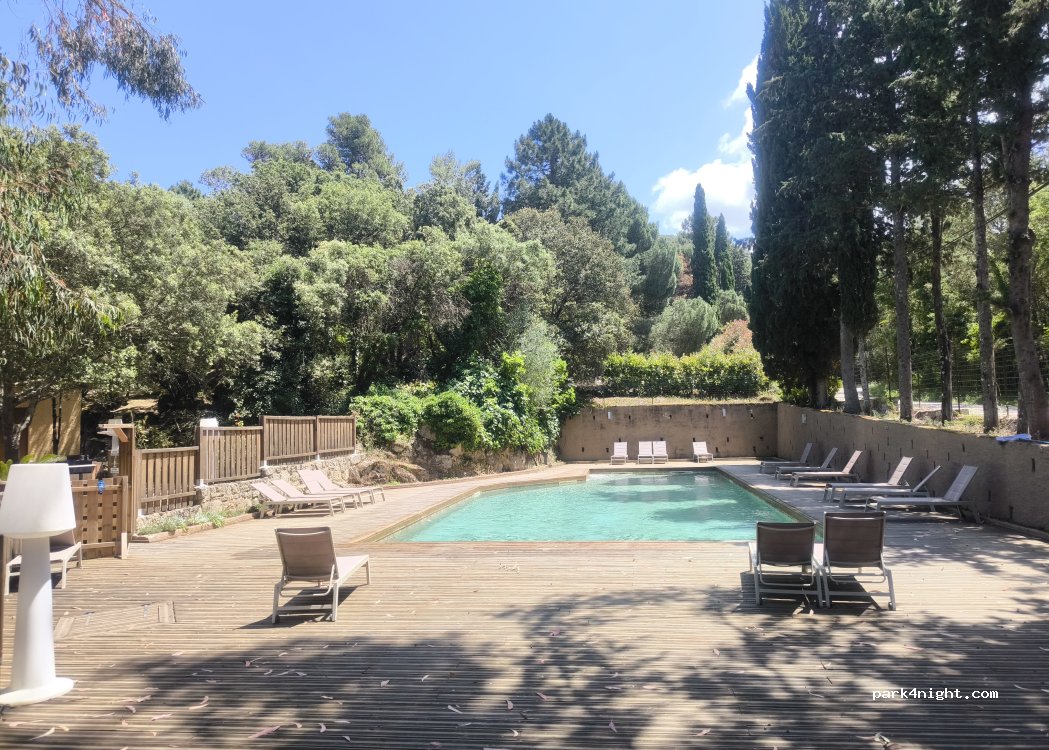 Camping bien ombragé. aucun service pour camping car. piscine sympa. soirée paella avec chants corses, 22€ même pour les enfants, cher....