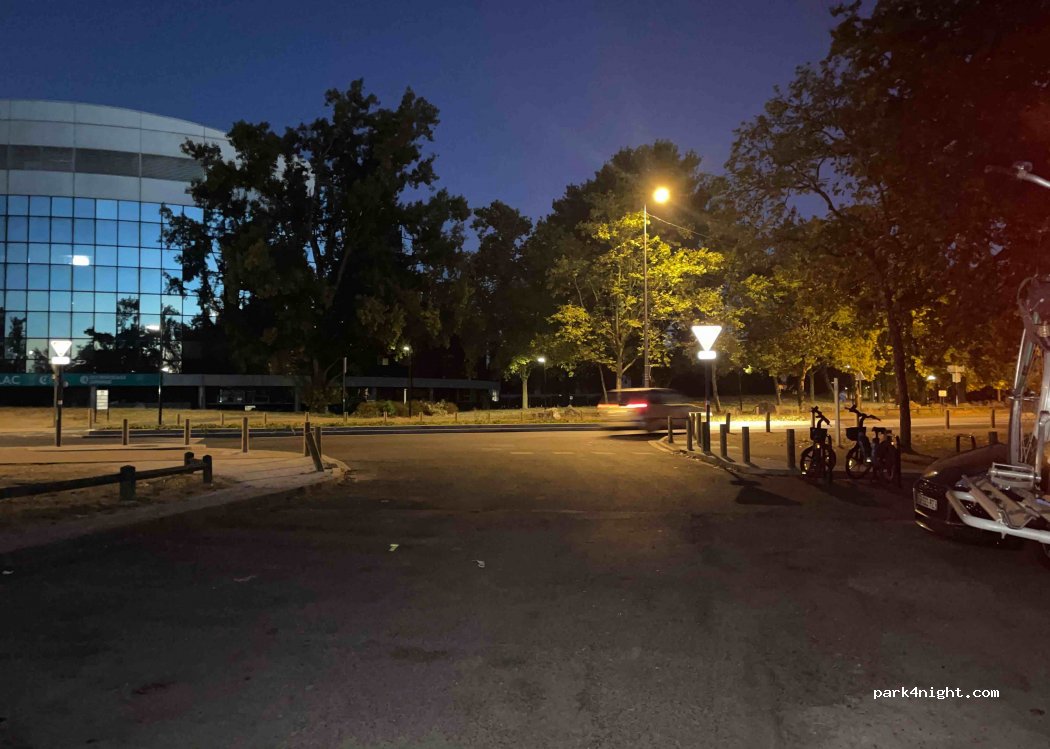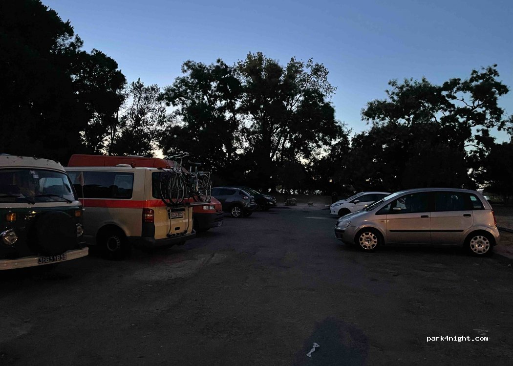 Perfect little carpark for SWB campers. it's a bit tight for manoeuvring. Good location by park, beach, outdoor shower and toilets. Quiet at night, hear the odd car on the nearby road. There's also a large modern shopping mall 0.6miles/1km away - Auchan Hypermarché Bordeaux-Lac.