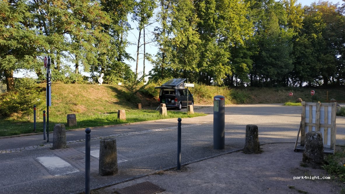 Parfait, pour le cadre, le calme et les toilettes de jour, très propres, mise à disposition à côté de l'office du tourisme. Nous somment arrivés vers 19h et y avons passé une nuit, il y avait 4 camping-cars. Départ de balade, le parking est aussi un accès direct à la vieille ville avec son château et ses restaurants (du château) où nous avons mangé des"flamenkuchs"pour un prix raisonnable.