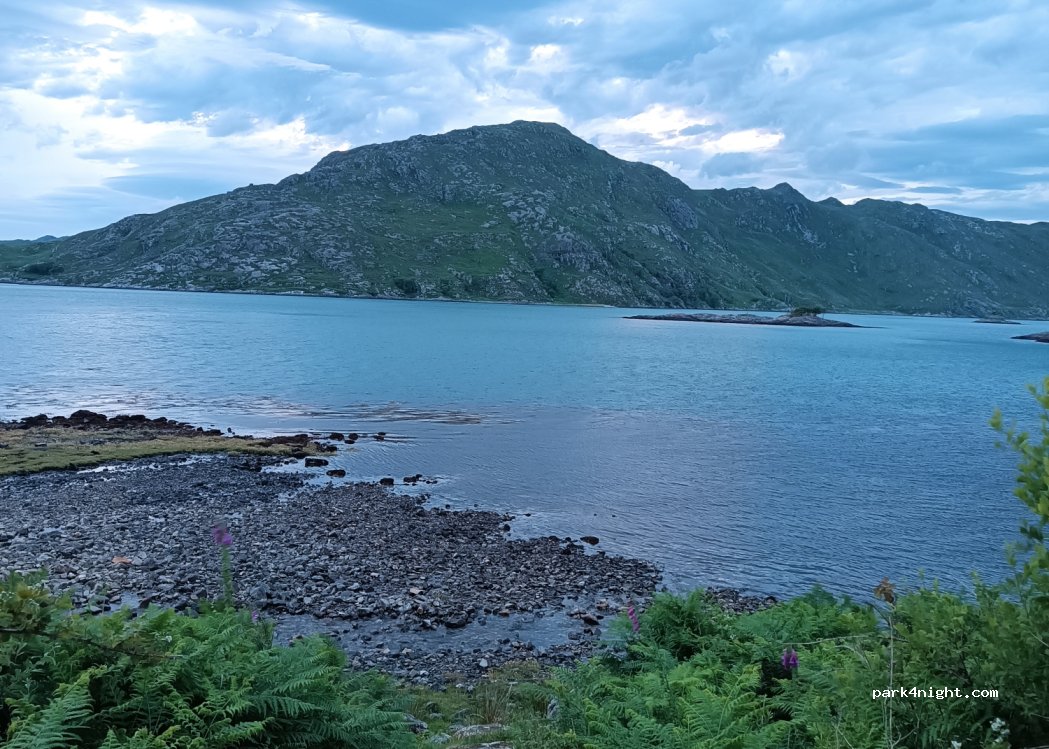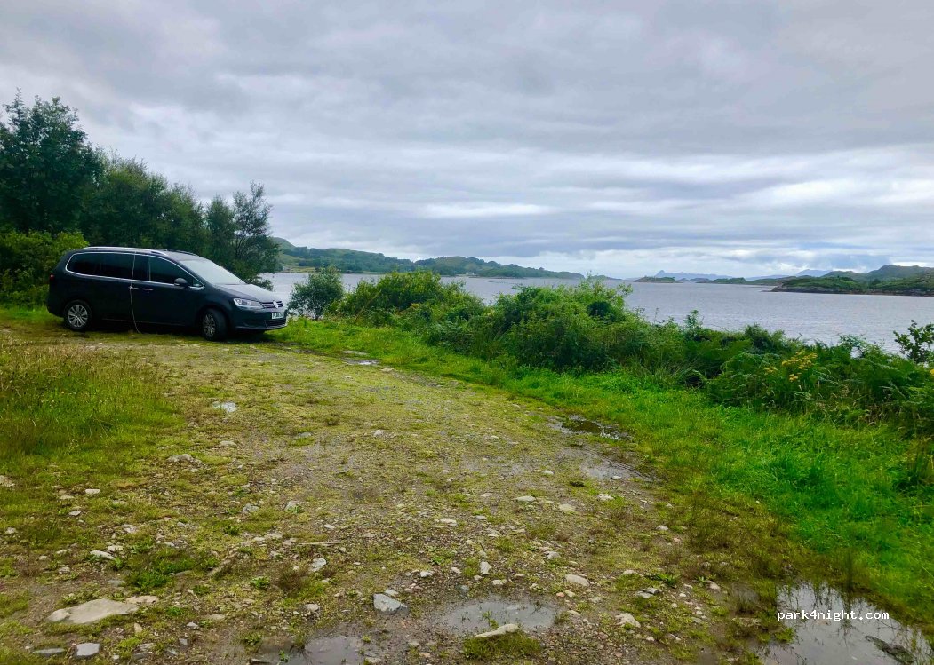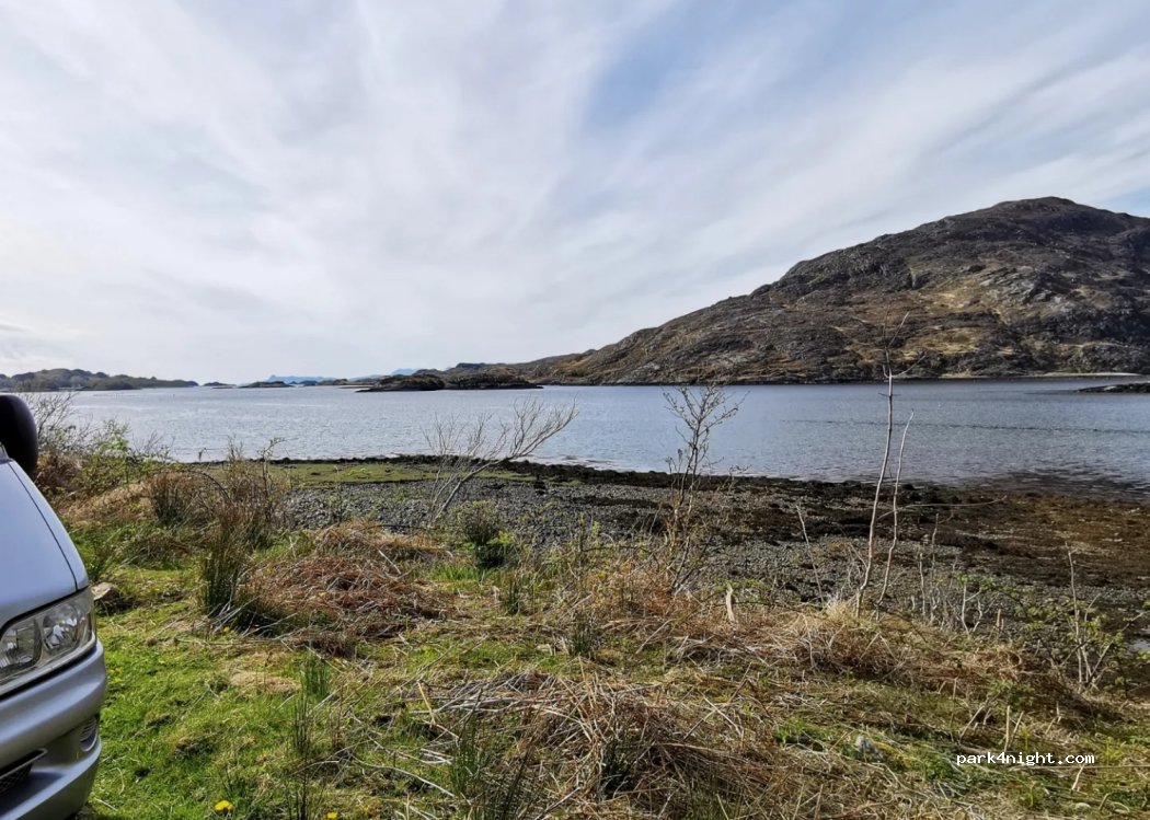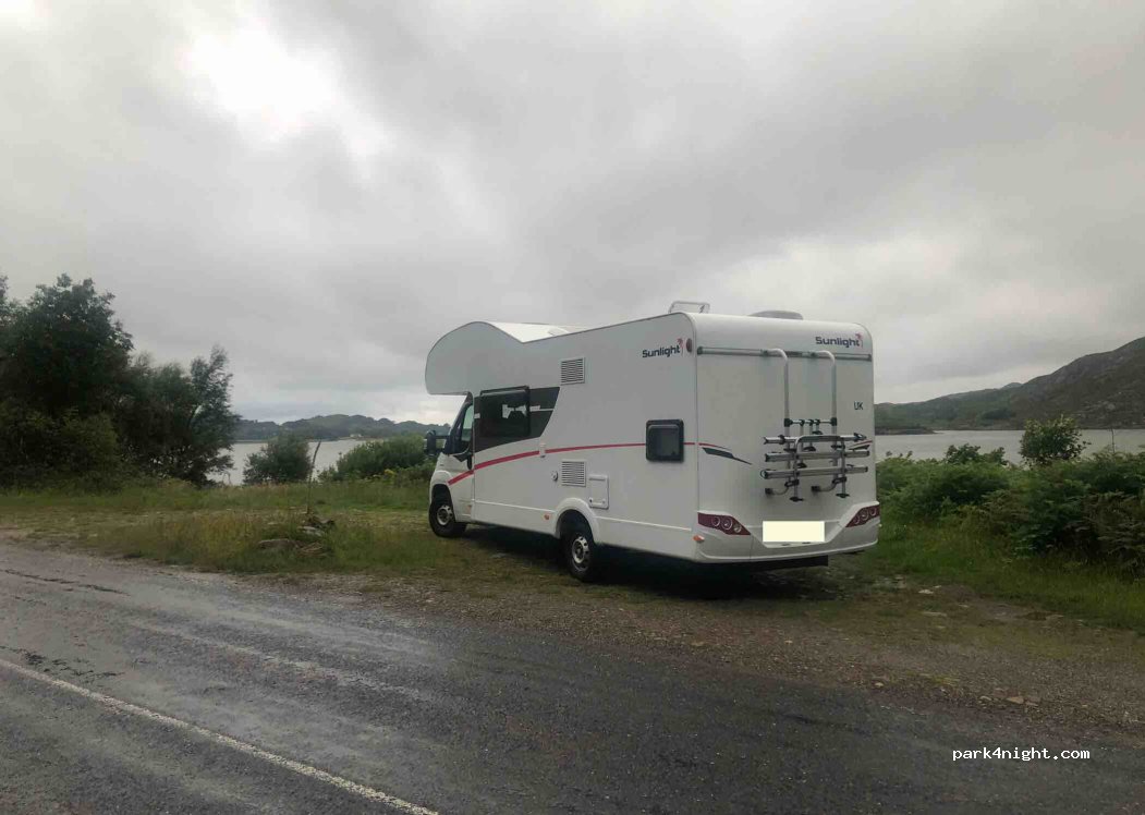 Large lay-by at side of the road enough room for a few vehicles with excellent views of the loch. Next to small water fall. Little to no traffic at night. A few similar parking shot along this road.