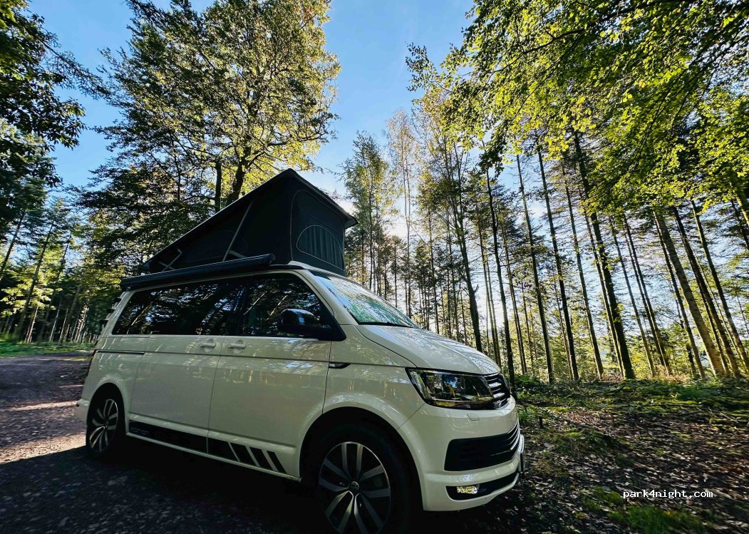 Schattiger, sauberer und ebener Stellplatz mitten im Wald mit Picknicktisch und Start der Wanderung