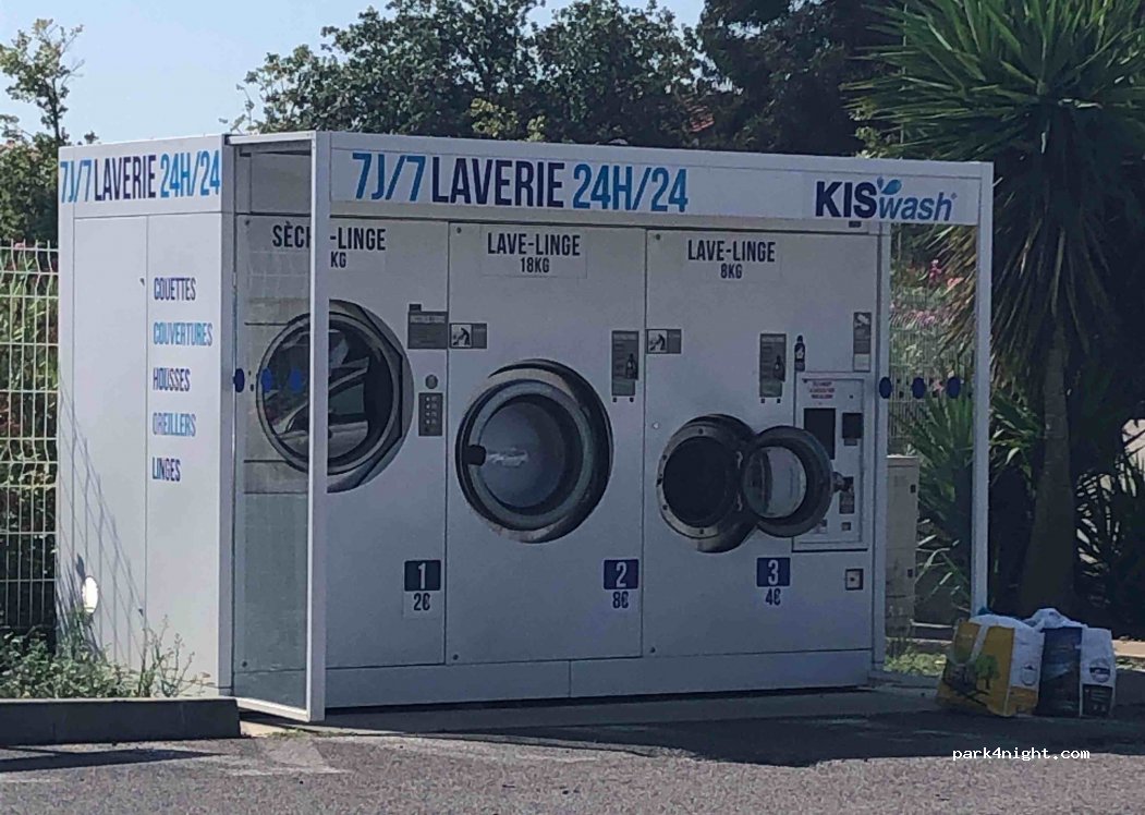 Rien à dire, tout fonctionne parfaitement et le séchage est efficace. on peut faire ses courses ou boire un coup et manger des gâteaux à la boulangerie. parking pouvant accueillir des grand camping-car et on peut même le laver sur l'aire de lavage qui est prévu pour les hauts camping-car.