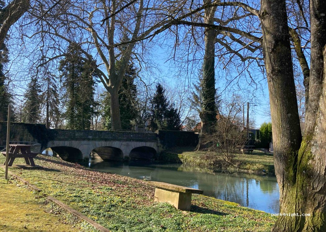Super petit coin de paradis petit parking très bien entretenu bordé d'un plan d'eau avec des noubreux canards et de hérons Parking et services gratuits Château et parc à visiter et deux restaurants très sympas à côté Au lieu d'une nuit j'y suis resté 2 nuits Merci à la municipalité