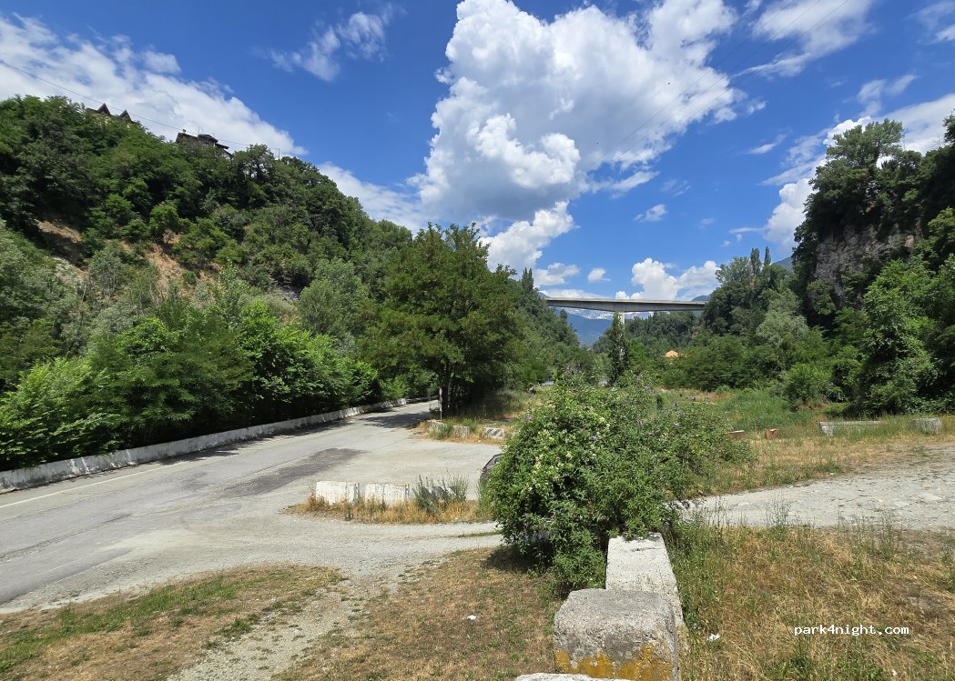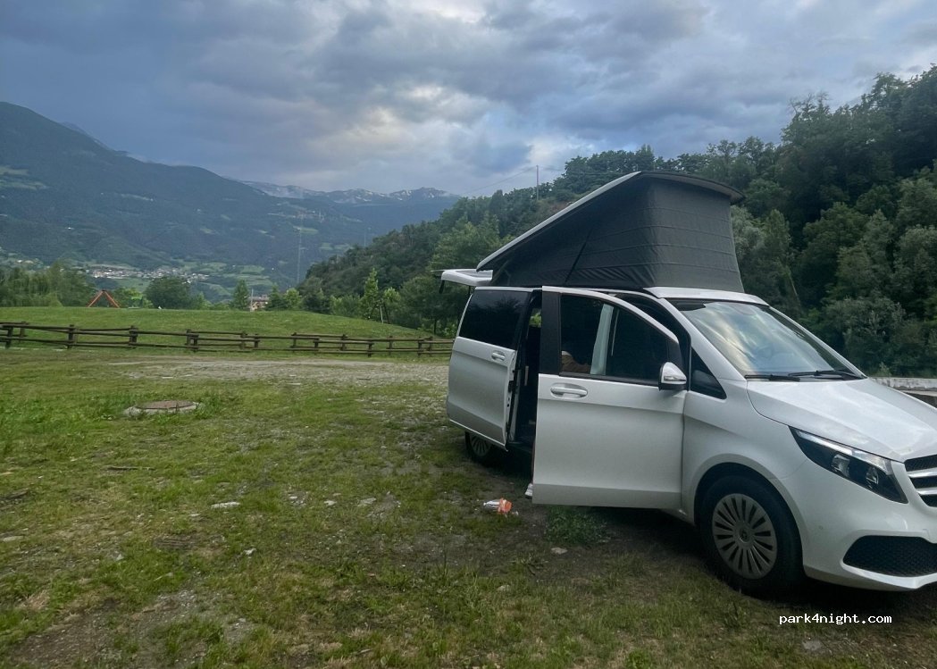 Very nice place near a small park. It was very quiet during the night we spent there. The water flowing around the park makes a bit of noise, but it's not a disturbance at all for sleeping. It's 10' by foot from the center of Aosta, and easily accessible with a van. Shouldn't be an issue with a camping car.