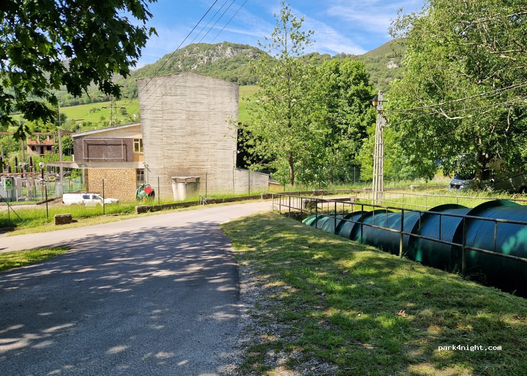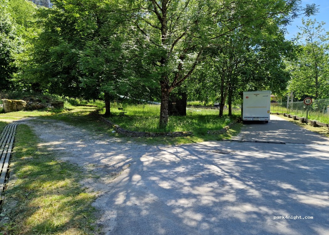 Dos plazas de aparcamiento en prado, a la sombra de los árboles. No asfaltado, justo al lado de un pequeño parquecillo con mesa y una fuente. En verano, buen recurso para no morir de calor en la explanada de autocaravanas.