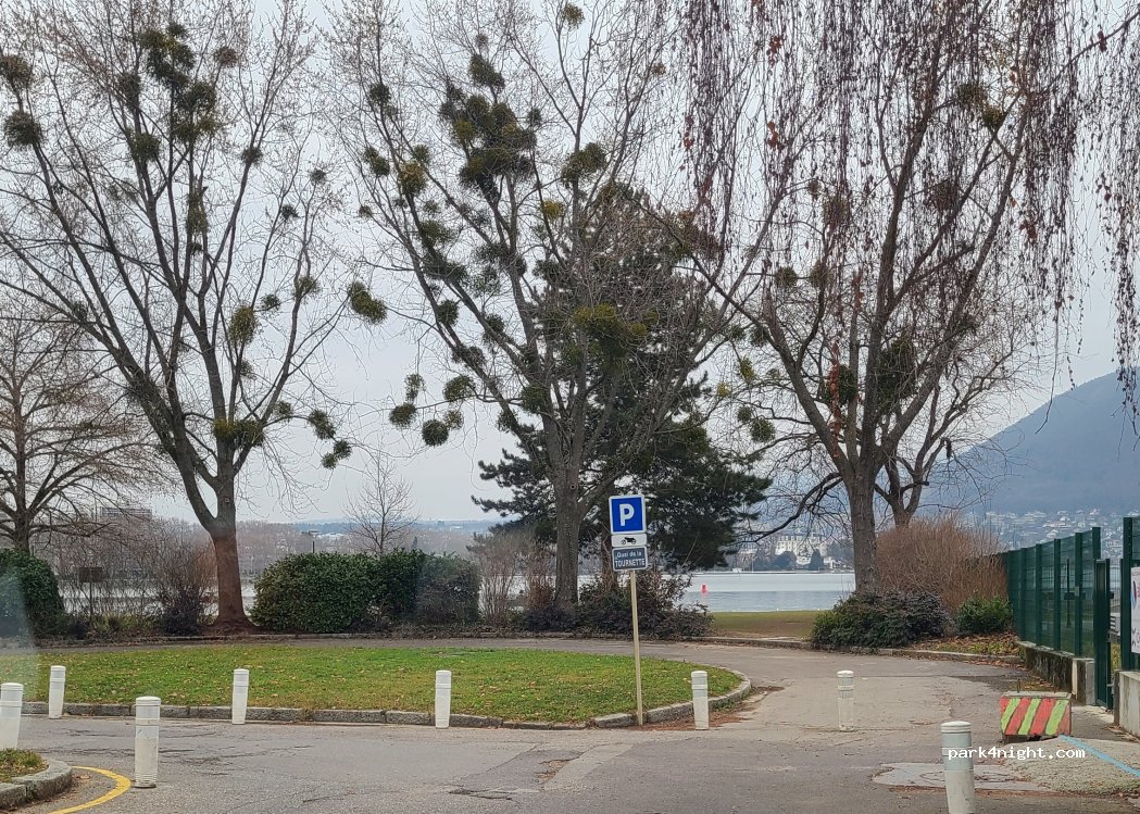 Parking très pratique ! Malgré notre hauteur (2m80) on a pu passer car les barrières étaient cassées ! Une belle vue sur le lac avec un beau parc pour promener les chiens c’est idéal !! Ça a été une nuit très calme, rien à redire ! La nuit n’est pas payante, ce n’est qu’à partir de 9h du matin. Parking à proximité de tout, c’est génial