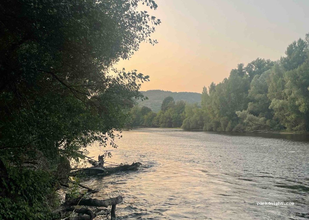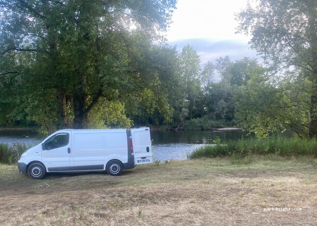 Accès par un petit chemin (ne pas accéder par la route car trop accidenté - gros véhicule accès compliqué). Au pied de la Dordogne avec vue sur le pont et bruit de l’eau, sympa et reposant. Peu de passage. Un voisin sympathique a pris le temps de discuter avec nous. Nous y avons passé une nuit.