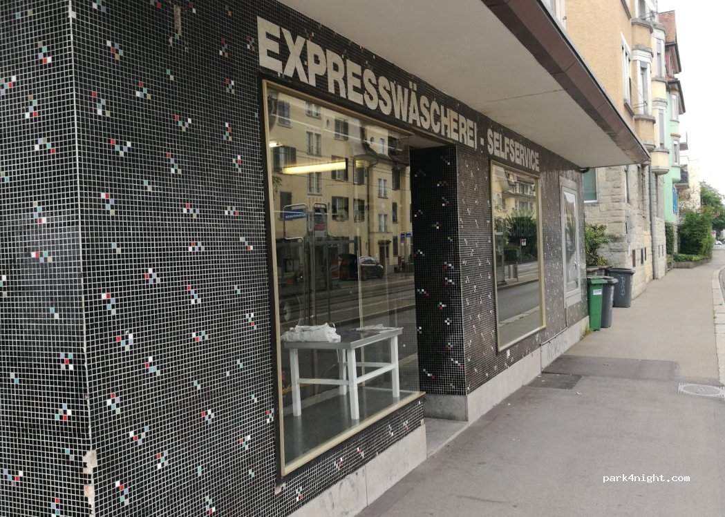 Laundromat open from 7 a.m. to 10 p.m. Payment by 1 Swiss franc coins, Swiss banknote coin mechanism inside.