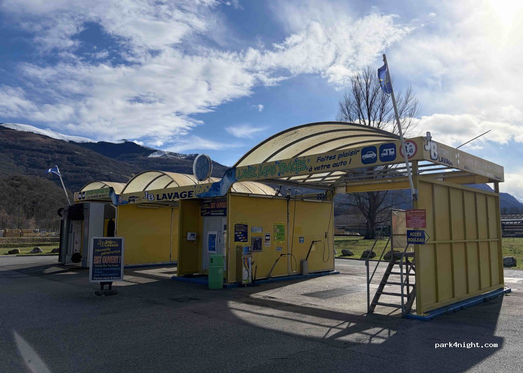 Très calme et pratique pour : les courses, laverie, gaz et gasoil. Malheureusement les services sont Hors Service , c'est bien dommage sinon cela aurait été un sans-faute pour ce supermarché qui a eu la bonne idée de créer un vrai espace camping-car. En haute saison, il faut accepter d'être garé les uns à côté des autres. Voie verte à vélo agréable à 300m et lieu départ idéal pour col d' Hautacam