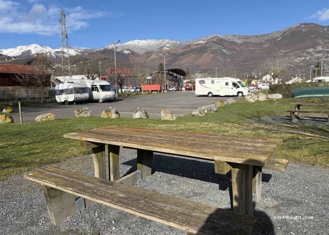 Excellent spot for a few nights. Clean, tarmac parking with stupendous mountain views. Not massive - would take about 20 units. Free aire with services (jeton)at the fuel station. 2€ for fresh water, black and grey water dump. Next to supermarket (Merci Carrefour) and 30 mins walk to the town. Near to velo vert routes.