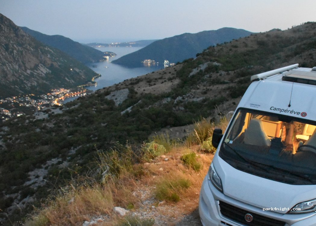 Muy buen lugar para dormir tranquilos cerca de la bahía de Kotor. El sitio es pequeño pero factible. Aparcamos cerca de la carretera ya que entrar más adentro es complicado con más de 7m. El camino de acceso es muy bueno. Muy buenas vistas y atardecer y muy silencioso. Solo pasaron 2 coches durante la tarde.