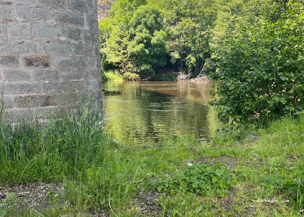 Il y’a le pont où passent les voitures, puis de là un petit chemin qui longe le grand pré et amène au 2ème pont, qui est pour le train, donc beaucoup moins bruyant. Accès à la rivière, mais en ce jour elle n’est pas propre. Réseau ok