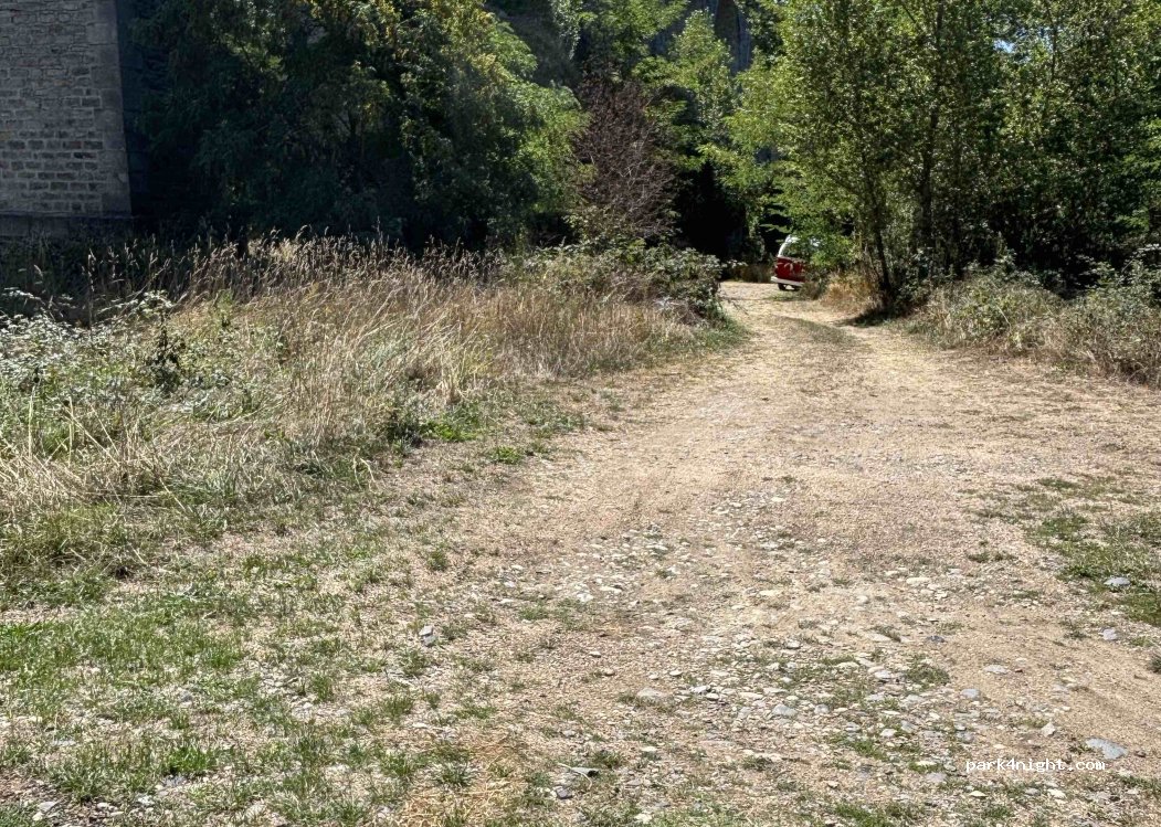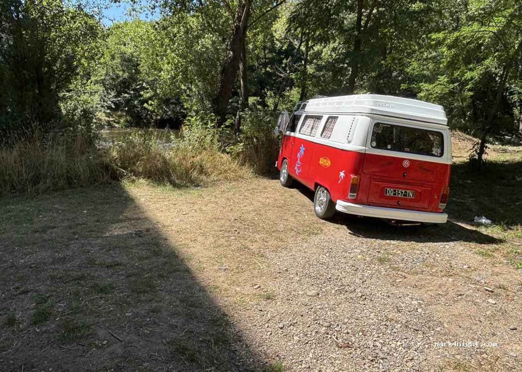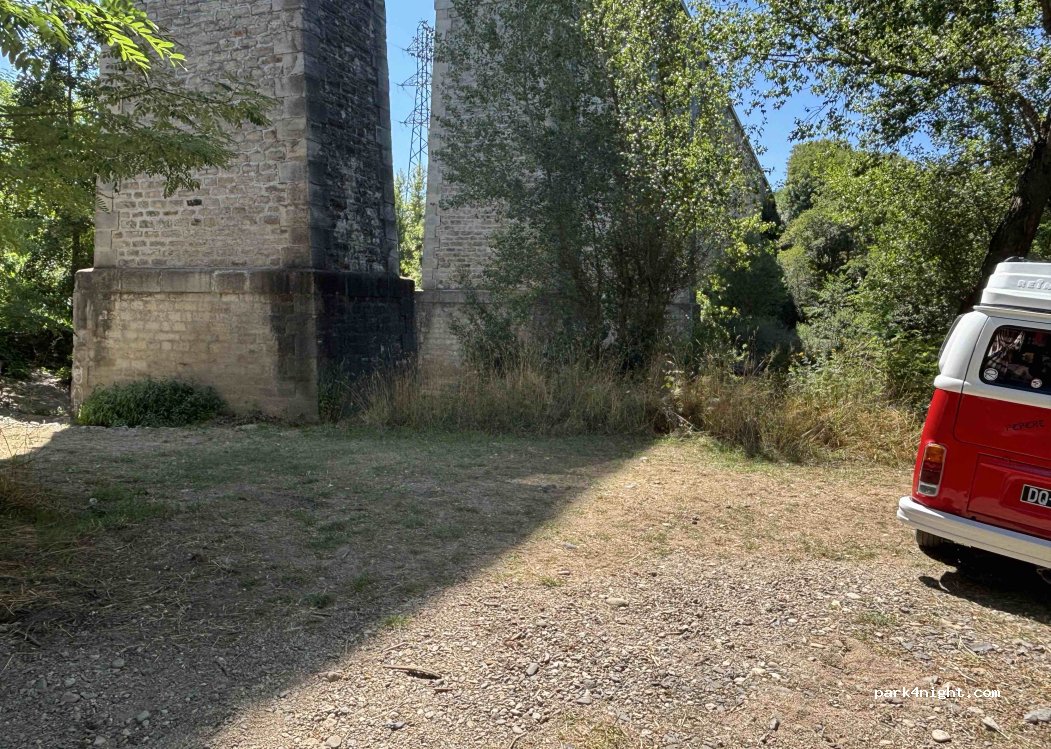 Emplacement de pêche pouvant accueillir un Camping car de 8m en bordure de l'eau. Baignade possible. Situé à 100m du spot sous le pont par un chemin carrossable par temps sec. Possibilité d'un deuxième CC le long du chemin. On entend les voitures qui passe sur le pont mais c'est pas très gênant. Nuit calme à partir de 19h00 à 08h00 quasi plus de circulation