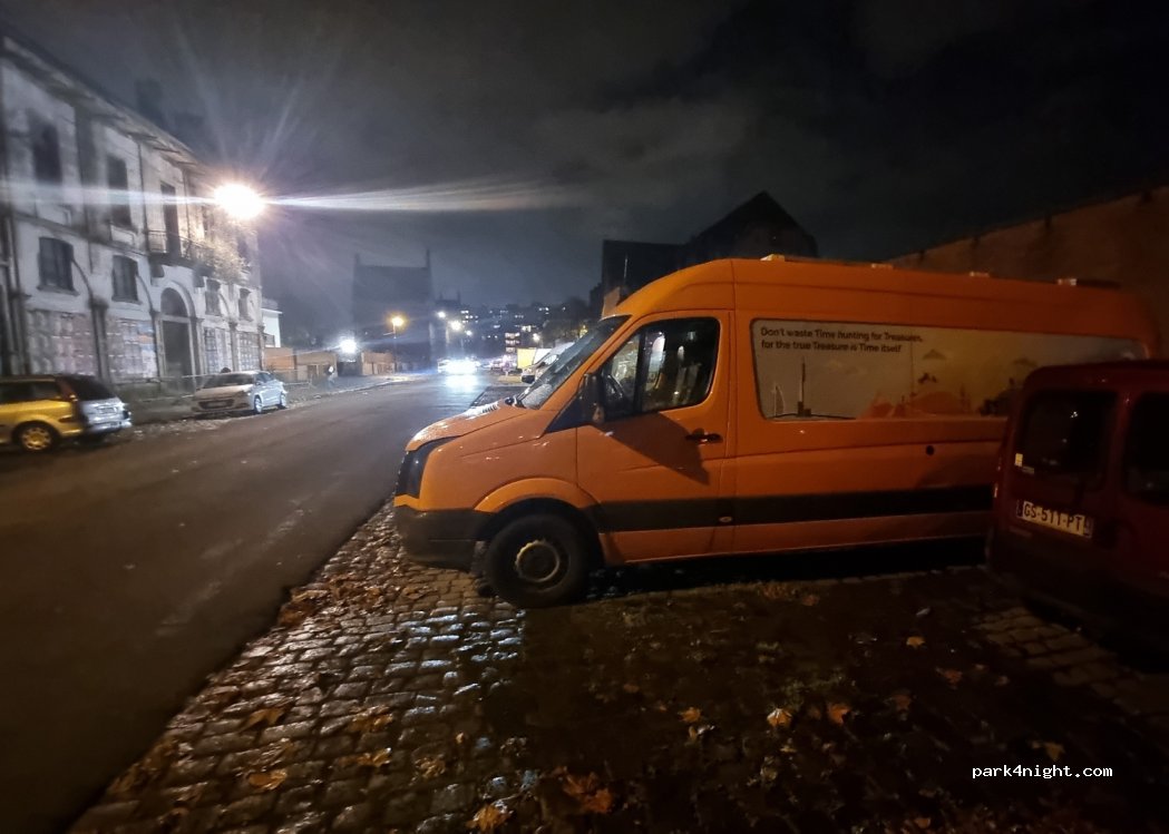 Gratis parkeren met extra lange plaatsen vlak voor een politiebureau. Diverse winkels liggen om de hoek. Ongeveer 15 minuten fietsen van het stadscentrum. Redelijk rustig 's nachts, geen verkeer meer na 6 uur.