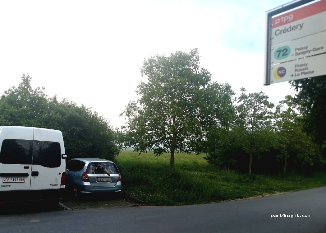 Parking avec une vue imprenable. Parfait pour aller en bus RL5 à Genève en 30m pour 3CHF. par contre, des locaux nous ont dit qu'une personne était venue prendre en photo nos plaques avant que nous soyons rentrés (22h30). Donc nous avons bougé pour ne pas dormir ici. Un panneau indique "camping interdit", cela inclus également de dormir dans son véhicule