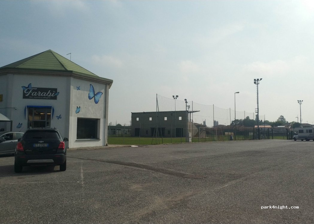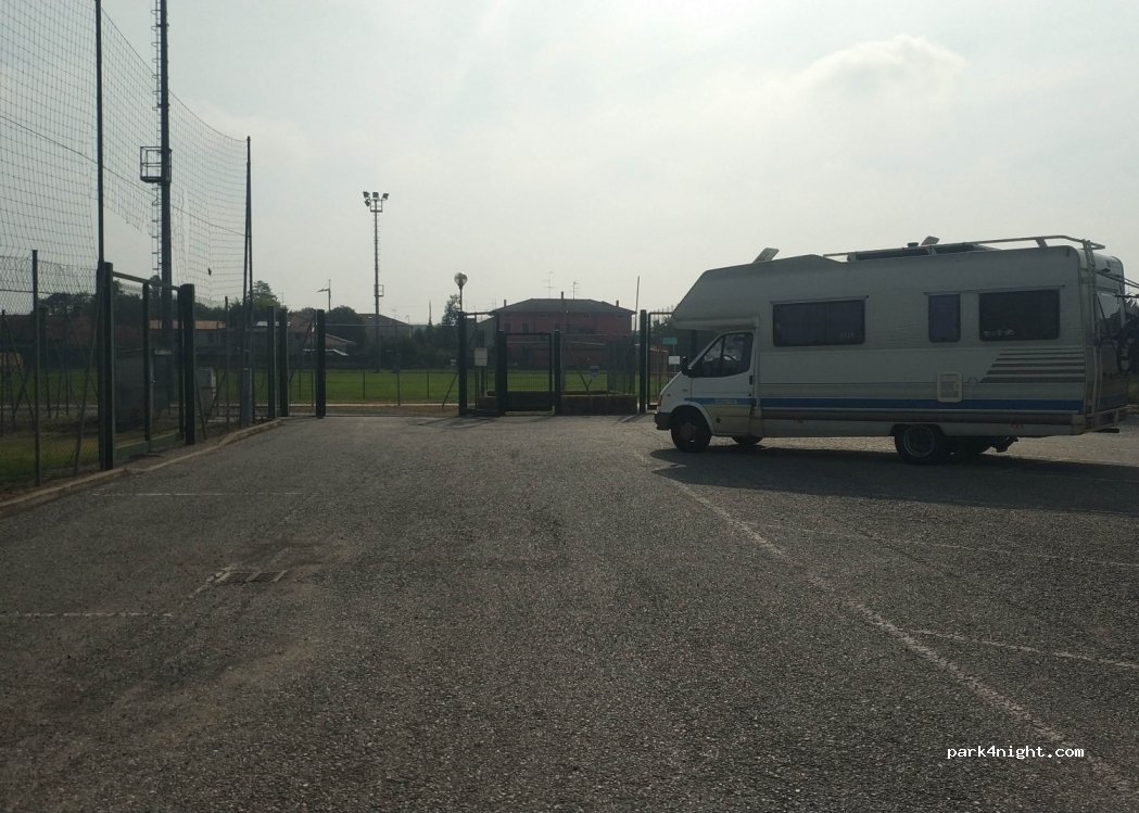 Grand parking gratuit attenant au terrain de sport Pomponesco. Pas d'interdiction explicite aux campeurs. Interdiction d'accès unique pour les camions pendant la nuit. Nous y avons passé une nuit tranquille et avons été réveillés par le chant du coq. À côté du parking, il y a un bar et des poubelles pour les déchets différenciés. Il y a une colonne avec des prises d'eau et d'électricité, mais je ne sais pas si elle est potable ou non... Piazza XXIII Aprile est à environ 550 mètres.
